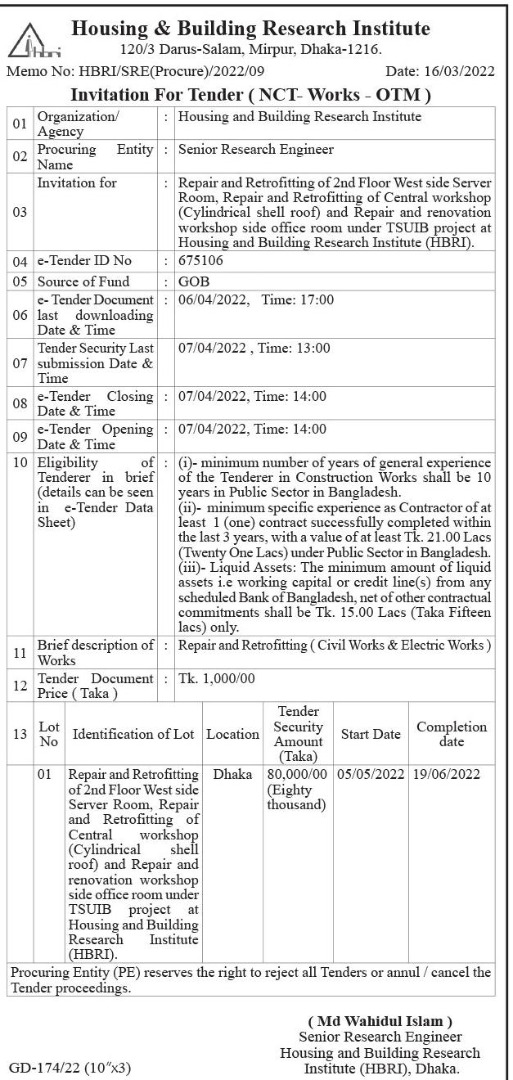 | 16/03/2022 | Repair and Retrofitting of 2nd Floor West side Server Room, Repair and Retrofitting of Cental Workshop (Cylindrical shell roof), and Repair and renovation of workshop side office room under TUSIB project at Housing and Building Research Institute (HBRI) | |