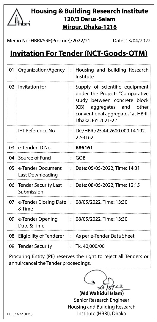| 18/04/2022 | Supply of scientific equipment under the project" Comparative study between concrete block (CB) aggregates and other conventional aggregates" at HBRI, Dhaka, FY:2021-22 | |