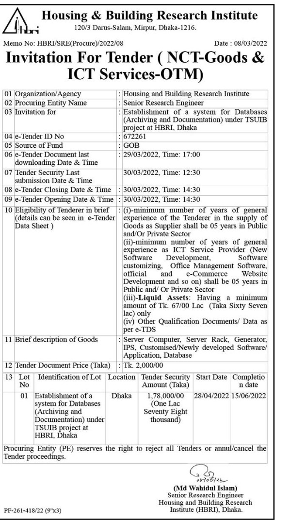 | 06/05/2025 | Supply of Outsurcing Manpower'(security guard) for Housing and Building Research Institute" Dhaka for the period 01 July, 2025 to 30 June, 2026. | |